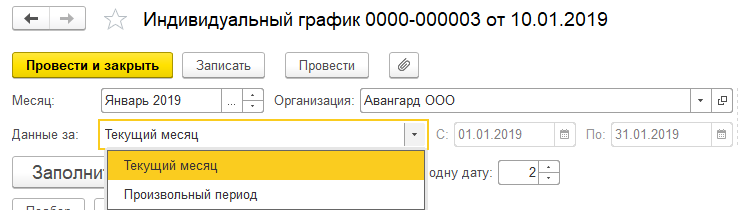В документе указывается расчетный период (месяц), в котором производится ввод индивидуальных графиков. Причем можно создать график, как за текущий, так и за произвольный период в рамках месяца.
