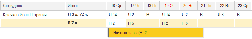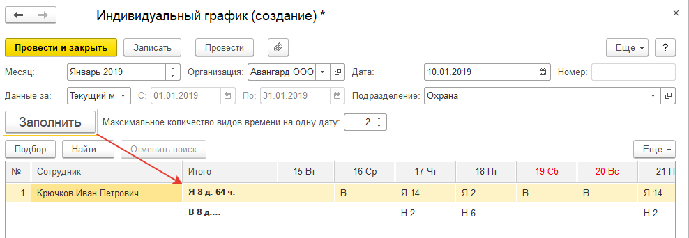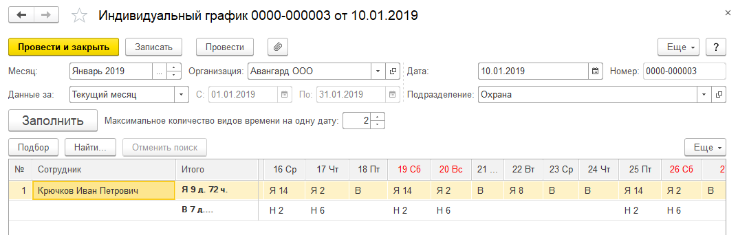 В документе будет заполнен сотрудник Крючков И.П., который работает в охране с 16го числа. Автоматически будет заполнен график работы сотрудника из кадровых приказов (в нашем примере это сменный график сутки/трое по 24ч.).