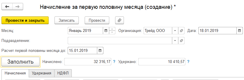 Рассчитаем зарплату за первую половину января 2019 года для организации ООО "Трейд". Для этого воспользуемся командой "Создать / Начисление зарплаты за первую половину месяца" на панели действий в разделе "Зарплата". Создадим и заполним документ "Начисление за первую половину месяца" для всех сотрудников.