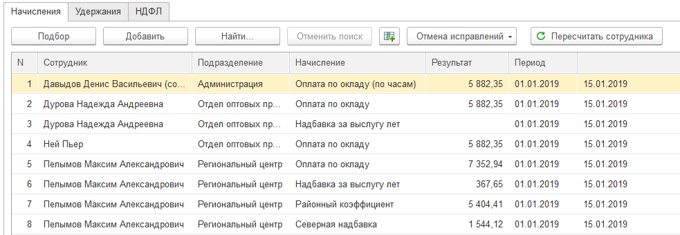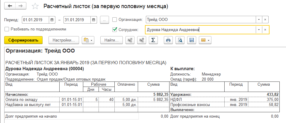 Обратите внимание: в документе учитываются те начисления, которые действуют в периоде по 15.01.2019 (например, постоянные надбавки, назначенные с 30.01.2019 или кадровые переводы в конце месяца при заполнении по 15.01.2019 учитываться не будут). Также учитывается отработанное время в соответствии с графиком работы каждого сотрудника.