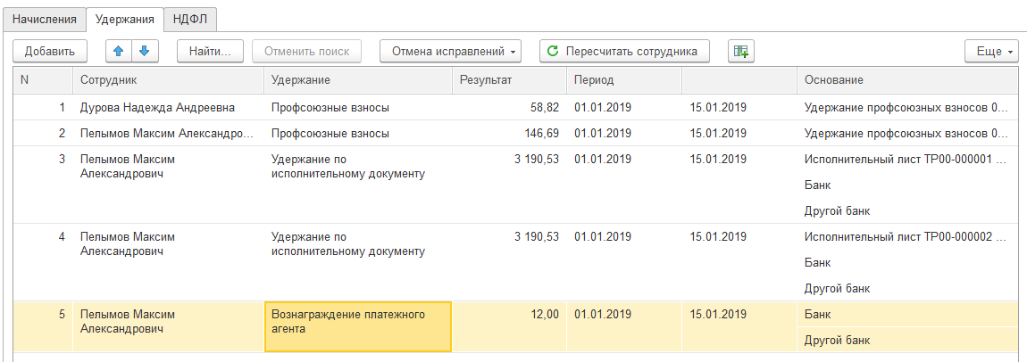 2. Проанализируем сумм удержаний, действующих с 01.01. по 15.01. Расчет: