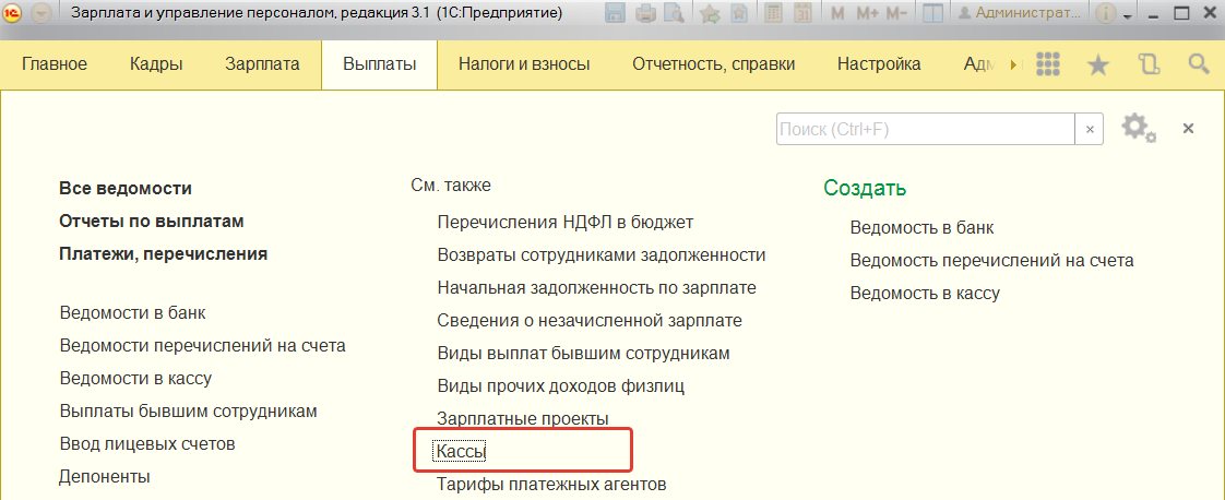 По умолчанию, если не выполнены никакие настройки мест выдачи зарплаты, выплата производится в кассу. Если в организации одна касса, то сведения о кассах можно не заполнять. Если же касс в организации несколько и разные сотрудники получают деньги в разных кассах, то можно ввести перечень касс в программу и затем выполнить настройки, кто в какой кассе будет получать деньги.