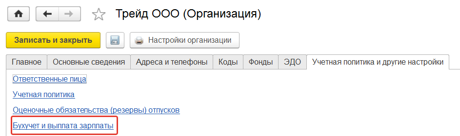 Настроим для организации ООО "Трейд" способ получения зарплаты – через кассу. Для этого из раздела "Настройки / Организации" откроем карточку ООО "Трейд".