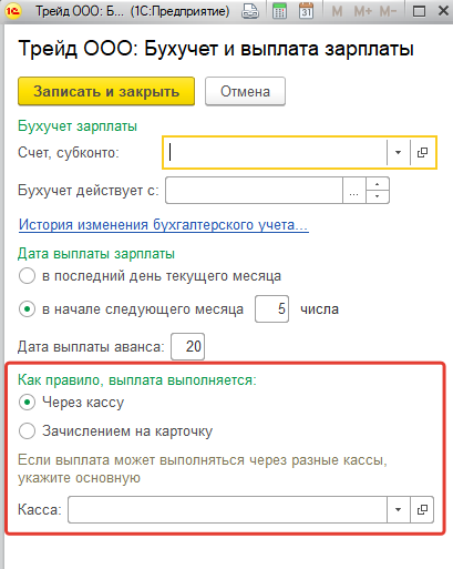 На закладке "Учетная политика и другие настройки" по ссылке "Бухучет и выплата зарплаты" проверим способ выплаты, т.к. касса в организации одна, то выбирать кассу не будем.