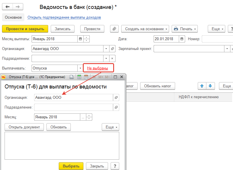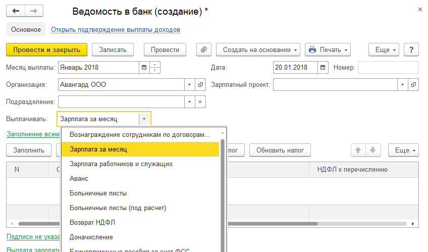 Также в ведомостях на выплату, кроме аванса, можно сразу ввести НДФЛ перечисленный (этот пример мы рассмотрим позднее).