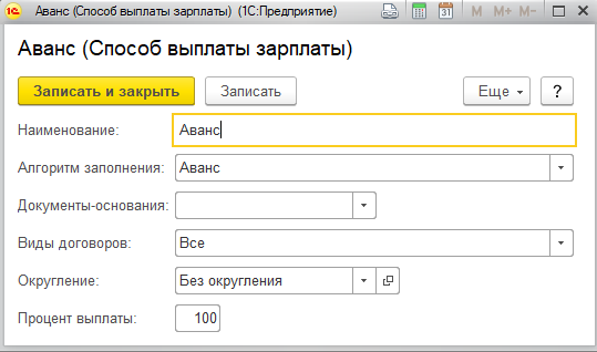 Обратите внимание, что характер выплаты выбирается из справочника "Способы выплаты зарплаты" (доступен в разделе "Настройка"). Элементы справочника поставляются полностью настроенными, и менять эти настройки без самой острой необходимости крайне не рекомендуется.