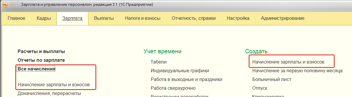 Окончательный расчет зарплаты за месяц производится документом "Начисление зарплаты и взносов". Документ доступен в разделе "Зарплата / Все начисления" либо "Зарплата / Начисление зарплаты и взносов".