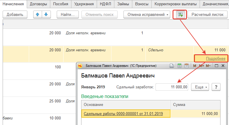 - Оплата по сдельному заработку по окладу рассчитывается исходя из месячной тарифной ставки 20 000 руб., принятого к учету отработанного времени (с 16 по 31 января учтено 12 дн.) и сведений о сдельном заработке, введенных документом "Данные для расчета зарплаты". Проанализировать учтенную сдельную оплату можно по кнопке "Подробнее", к расчету принято 11 000 руб.