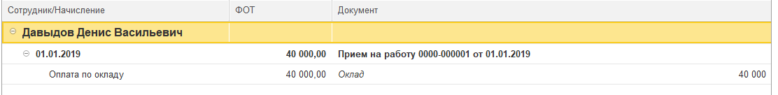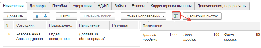 Если выполнялись дополнительные задания и вводились данные для доплаты за объем продаж, то должна сформироваться строка с доплатой. Однако сумма будет равна нулю, поскольку план продаж не выполнен.