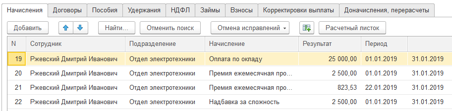Заполнение закладок по доначислениям и договорам подряда мы проанализируем при расчете зарплаты за третий месяц.
