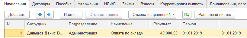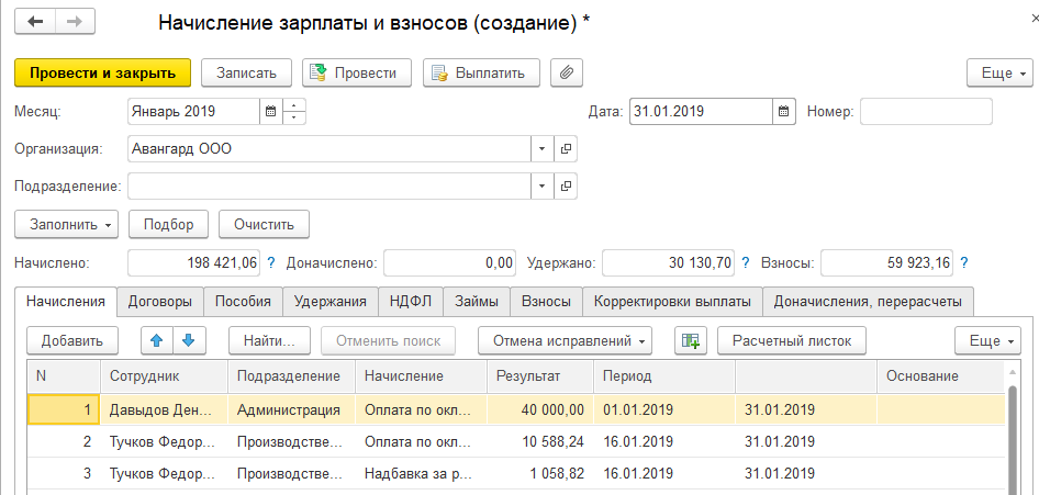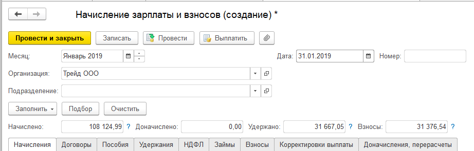 Необходимо начислить зарплату сотрудникам ООО "Трейд" за январь 2019г. Рассчитаем и проведем документ "Начисление зарплаты и взносов".