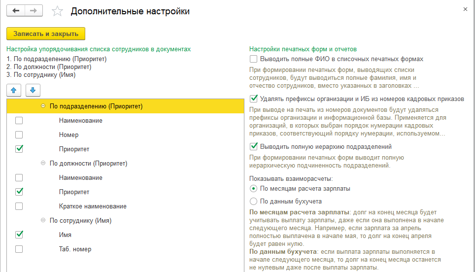 Напомним, что в разделе "Настройка / Дополнительные настройки" есть возможность управлять выводом информации в печатные формы (рассматривали при изучении документов по приёмам на работу), а также упорядочиванием списка сотрудников в документах программы.