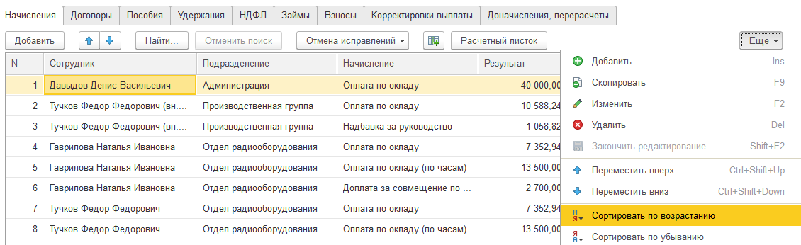 По умолчанию сотрудники сортируются по подразделениям, затем по должности и затем по ФИО.