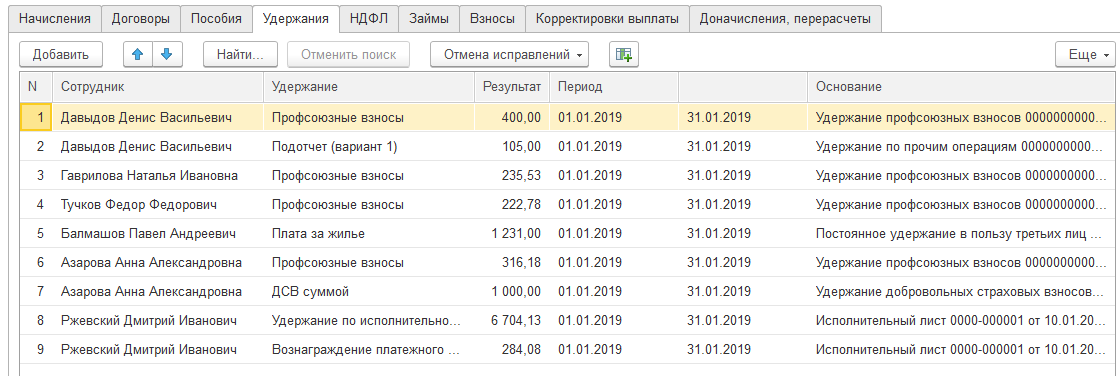 В нашей учебной базе рассчитаны суммы постоянных удержаний, введенных различными документами по удержаниям для сотрудников ООО "Авангард".