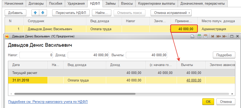 Анализ рассчитанных сумм по НДФЛ можно производить в самом документе, используя переход к данным по вычетам и регистру налогового учета по НДФЛ.