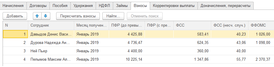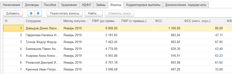 В нашей учебной базе за январь не вводились отдельные документы по расчету сумм сотрудникам ООО "Авангард", следовательно, взносы рассчитаны только по данным текущего документа.