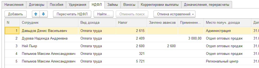 - НДФЛ – рассчитываются суммы НДФЛ;