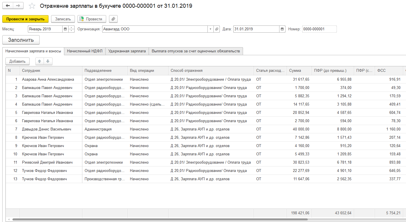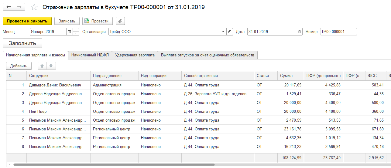 Начисленная зарплата и взносы – в соответствии с настроенными способами отражения в учете.
