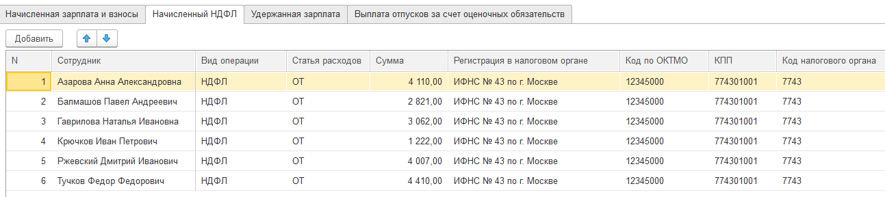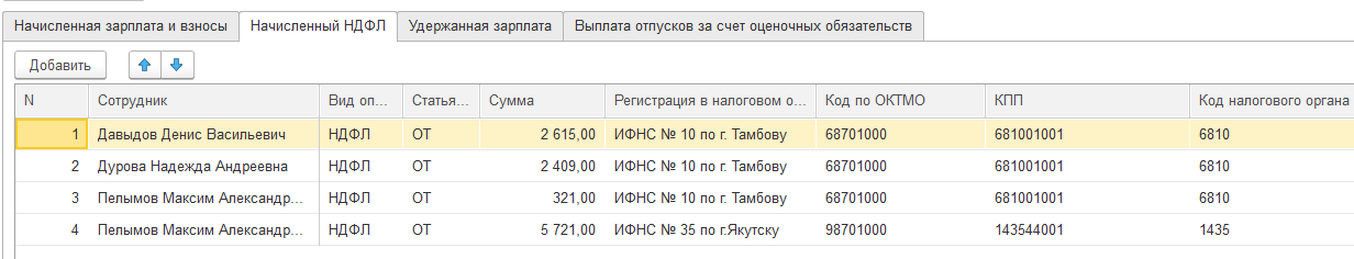 Проанализируем суммы удержаний по отчету "Бухучет": налог по всем сотрудникам отражен по ИФНС г. Тамбова, кроме НДФЛ Пелымова М.А. за период его работы в региональном центре.