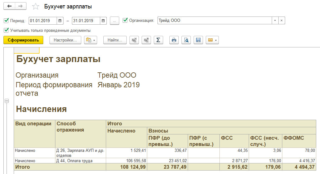 Откроем в разделе "Зарплата/ Отчеты по зарплате" отчет "Бухучет зарплаты". Сформируем по организации ООО "Трейд" за январь 2019г.