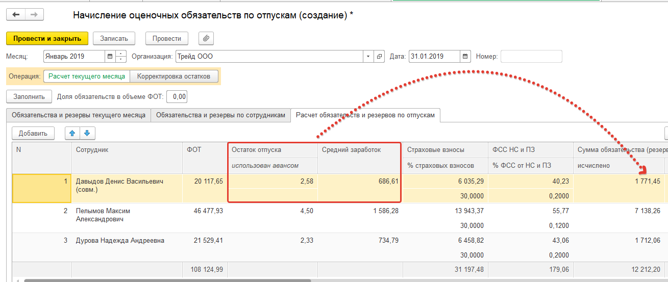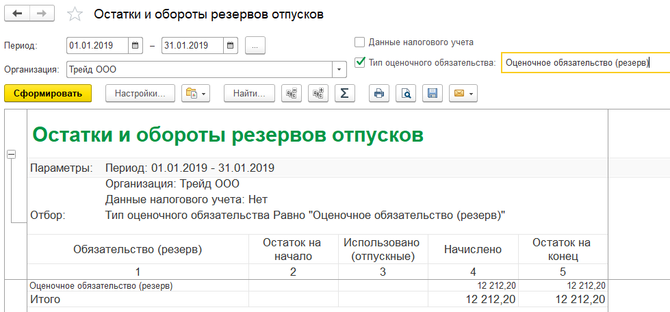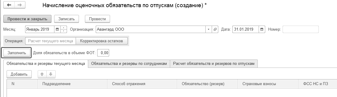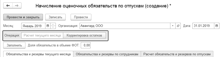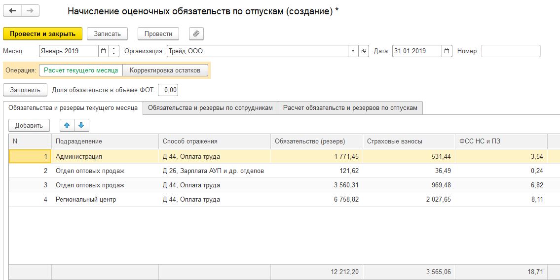2. Сформируем документ "Начисление оценочных обязательств по отпускам" за январь 2019г. для ООО "Трейд" аналогичным образом. Напомним, что в учетной политике данной организации был выбран способ расчета обязательств – Метод МСФО.