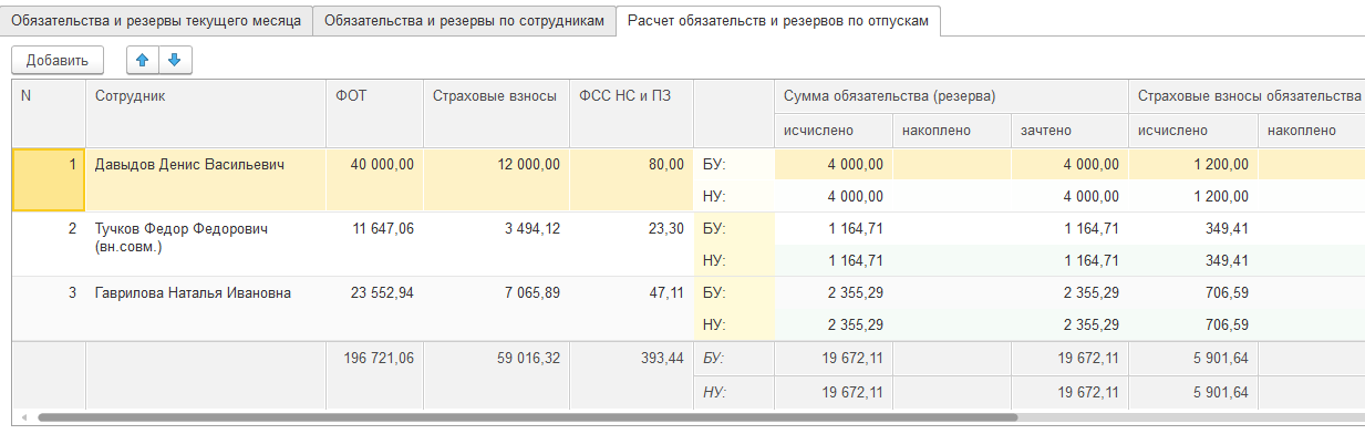 На закладке "Обязательства и резервы текущего месяца" отражаются итоговые сводные данные для передачи в бухгалтерскую программу в разрезе подразделений и способов отражения. Способы отражения определяются по тем начислениям, от базы которых рассчитаны обязательства. На закладке "Расчет обязательств и резервов по отпускам" представлен расчет этих же обязательств, в разрезе сотрудников. Эта информация может использоваться для контроля и анализа расчета.