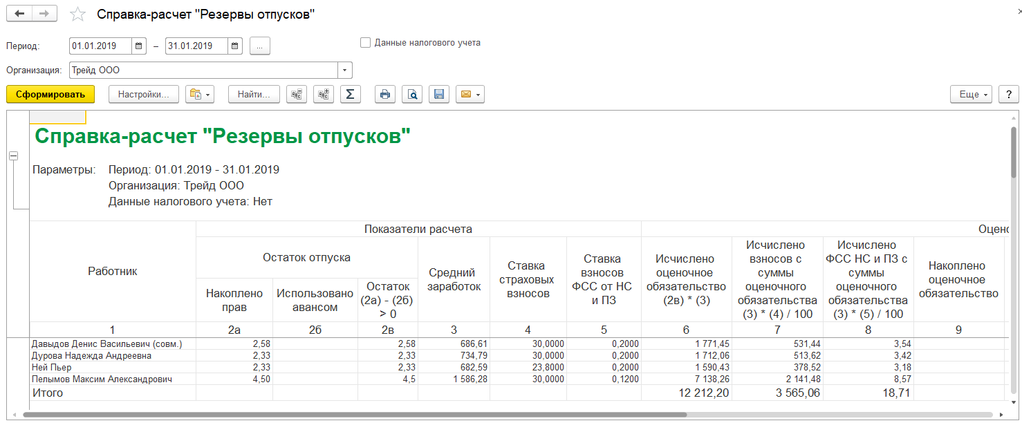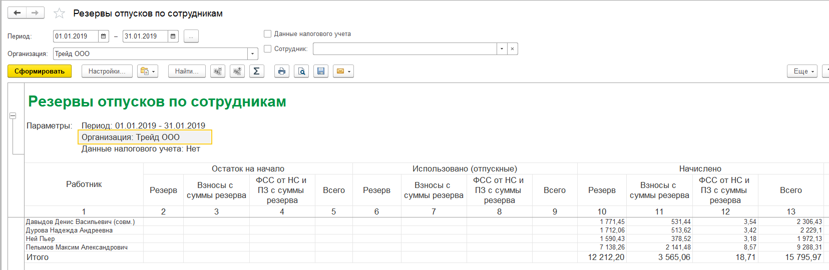 2) "Резервы отпусков по сотрудникам" - в отчете можно проанализировать расчет резерва отпусков, остатки и обороты по каждому сотруднику в отдельности.