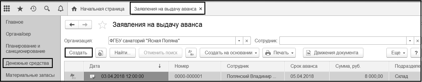 Чтобы распечатать заявление на выдачу аванса, его необходимо предварительно записать с помощью кнопки