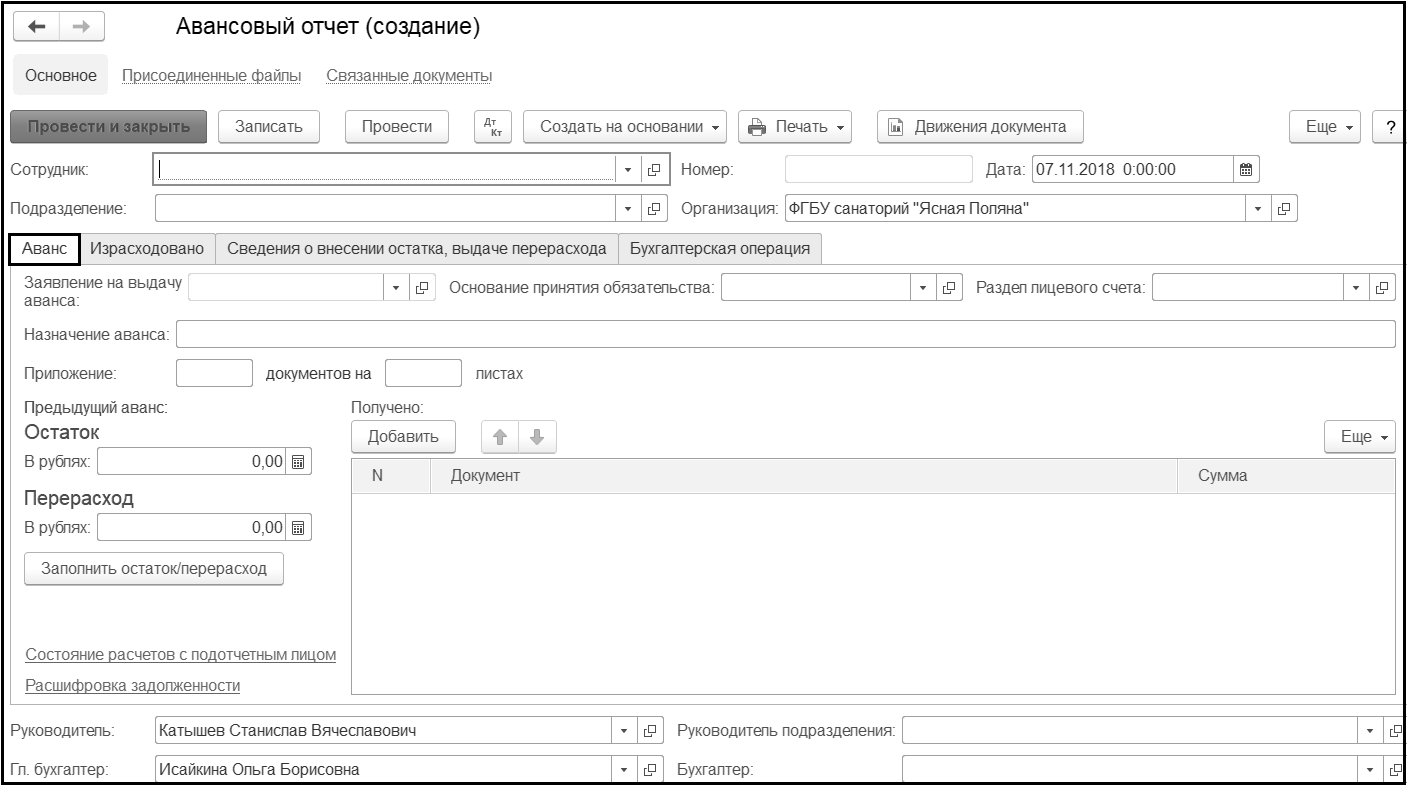 Отметим, что если Авансовый отчет создается на основании Заявления на выдачу аванса, то при проведении Авансового отчета происходит корректировка денежных обязательств перед подотчетным лицом, принятых при утверждении Заявления на выдачу аванса.