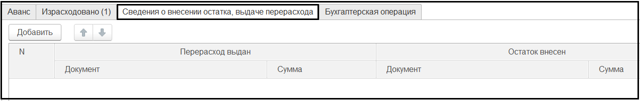 На закладке Сведения о внесении остатка, выдаче перерасхода можно указать документы, которыми были зарегистрированы перерасход или внесение остатка по данному авансовому отчету.