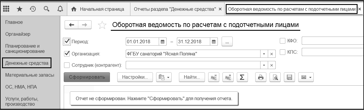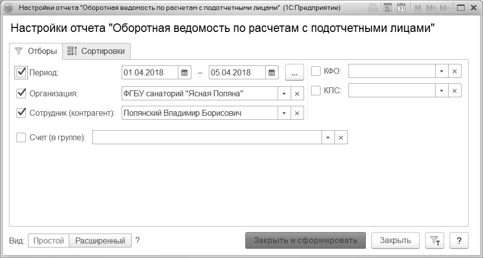 При необходимости в настройках отчета можно указать отбор по контрагенту, КФО, КПС.