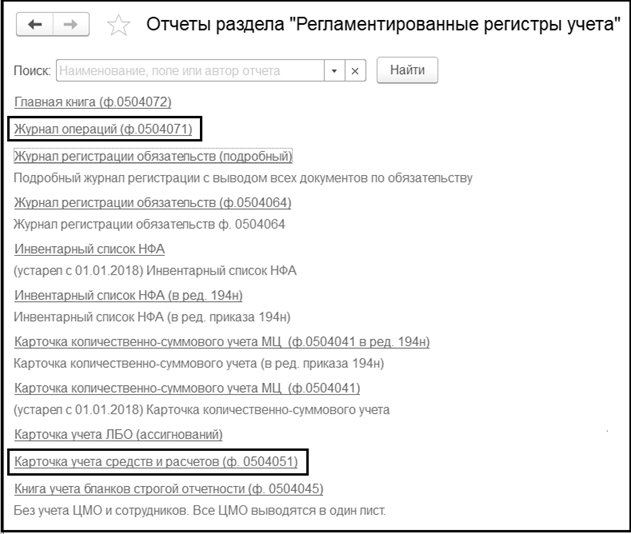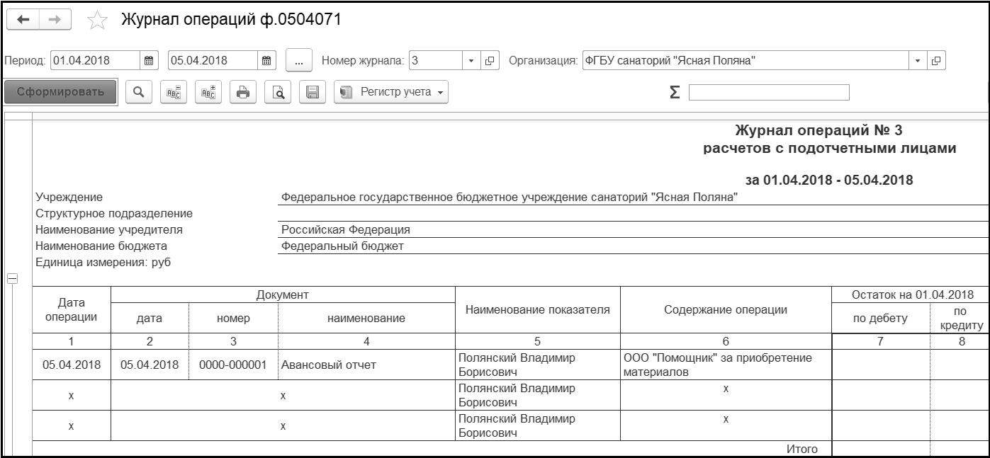 Отчет Журнал операций ф.0504071 (фрагмент 1)