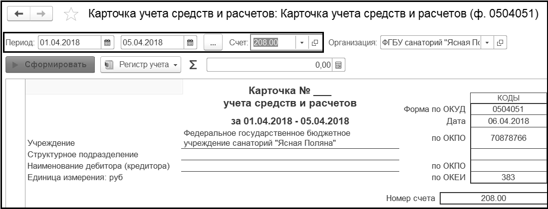 Карточка учета средств и расчетов (форма по ОКУД 0504051) применяется для аналитического учета операций с финансовыми активами и обязательствами в разрезе счетов бухгалтерского учета, а при необходимости - в разрезе дебиторов и кредиторов, в частности - расчетов с дебиторами; расчетов с подотчетными лицами.