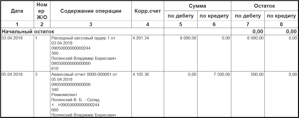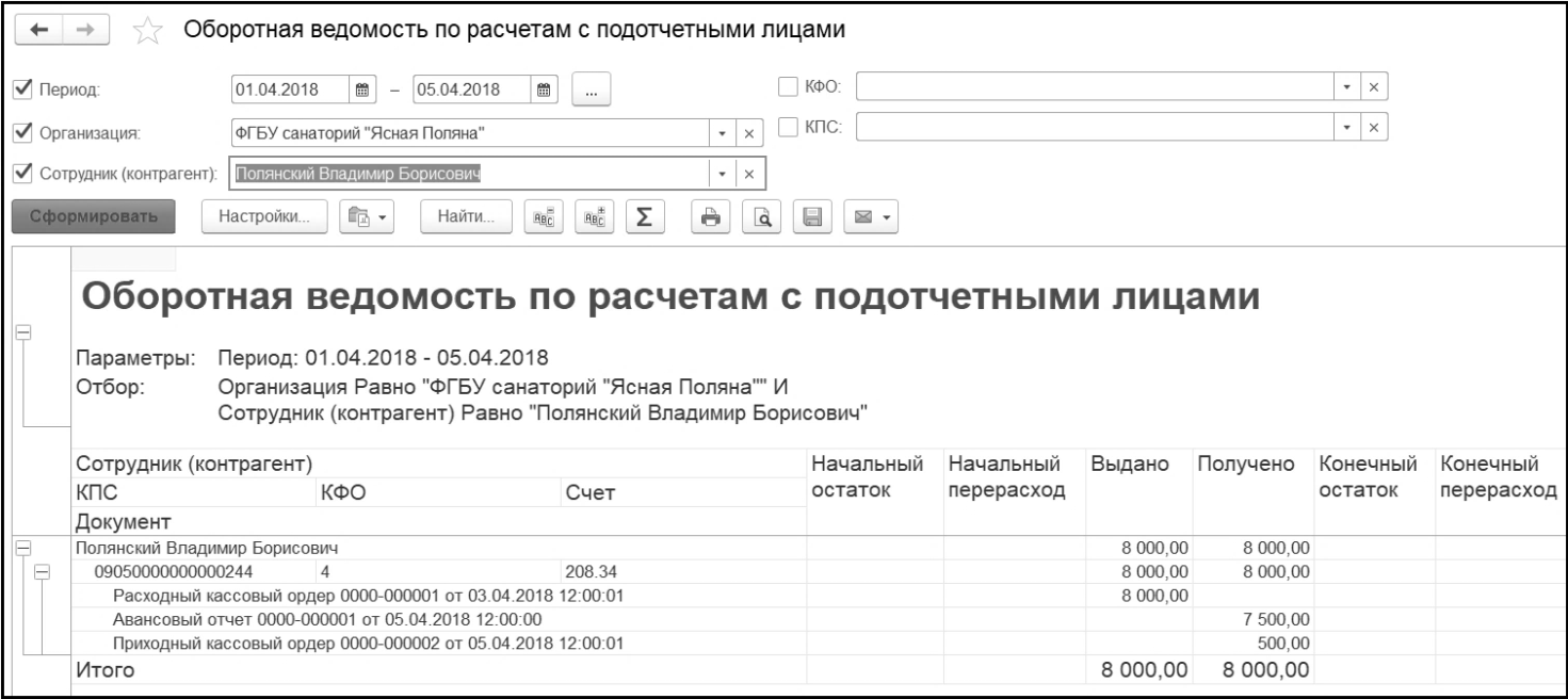 В отчете приводятся остатки и обороты по подотчетным лицам в разрезе ИФО, КФО, КПС, субсчетов счета 208 00 и документов, формирующих движения по счету 208 00.