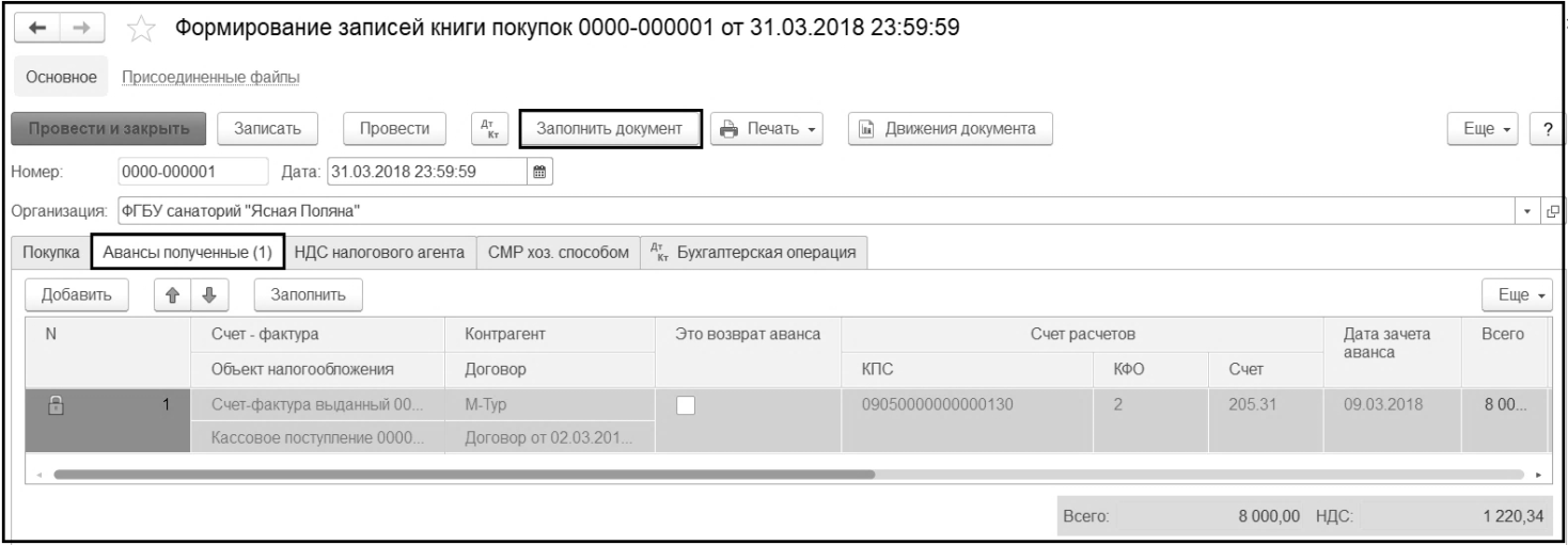Далее по кнопке Заполнить документ автоматически регистрируется Счет-фактура выданная на аванс в разделе Авансы полученные.