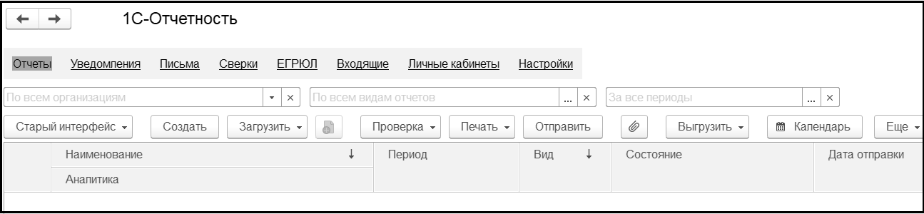 Форма 1С-Отчетность содержит несколько разделов. Созданные регламентированные отчеты находятся в разделе Отчеты.