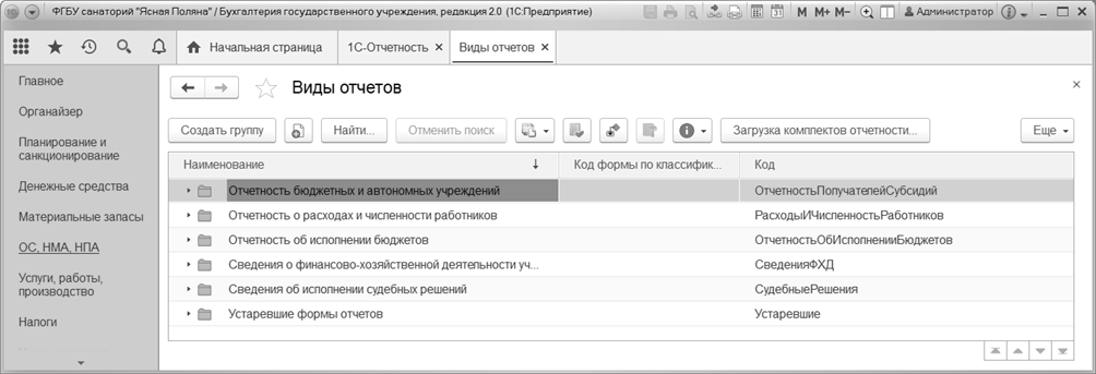 В разделе Отчеты предусмотрен отбор отчетов по полям Организация, Вид отчета и Период отчета.