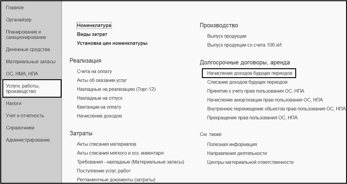 5.Для отражения в учете признания доходами текущего финансового года доходов от предоставления права пользования активом следует использовать документ Списание доходов будущих периодов (раздел Услуги, работы, производство – Долгосрочные договоры, аренда).