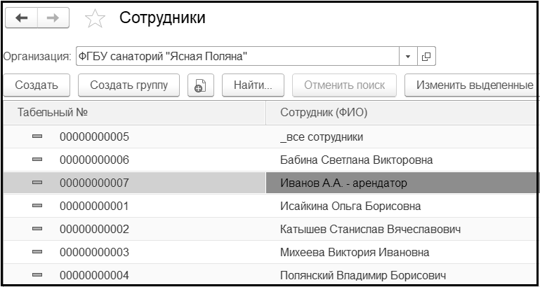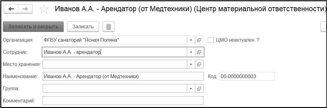 Для этого в справочники Сотрудники и Центр материальной ответственности добавим новый элемент – Иванов А.А. – Арендатор