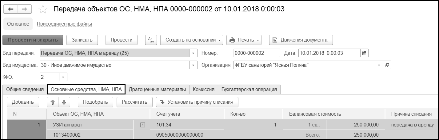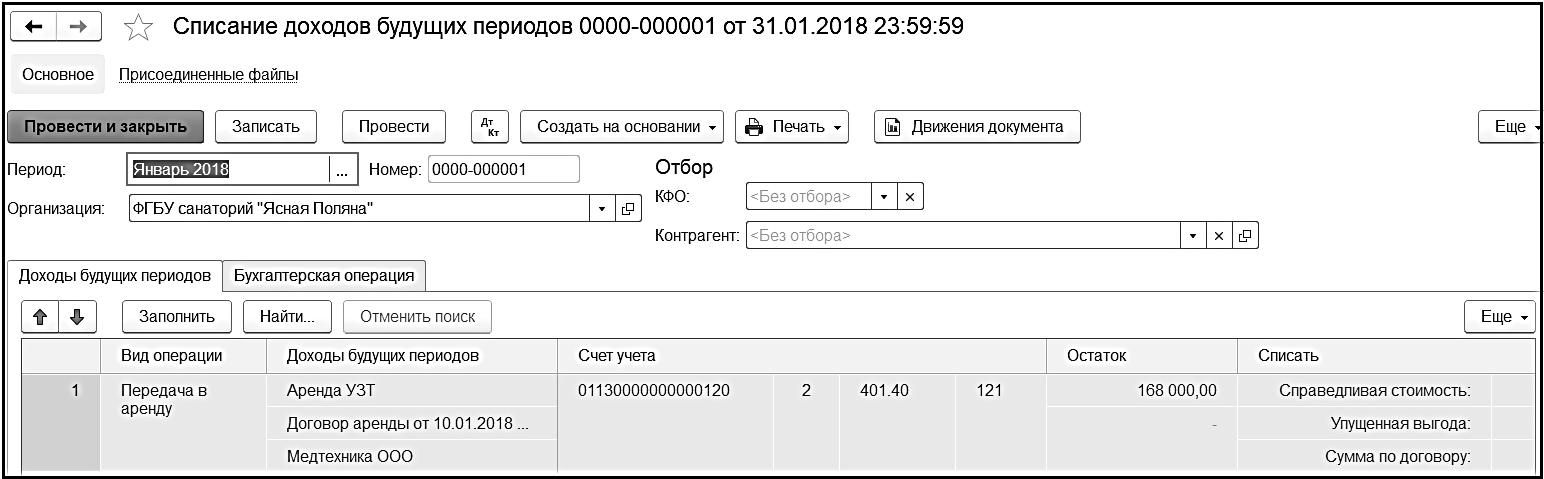 Документ позволяет признать в текущем отчетном периоде как доходы будущих периодов (ДБП), так и расходы будущих периодов (РБП) по упущенной выгоде при передаче имущества в аренду на льготных условиях и при безвозмездной передаче.