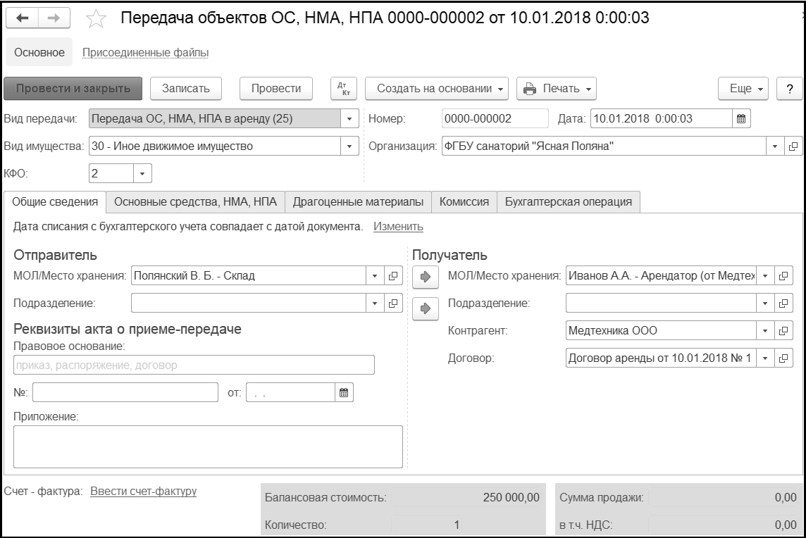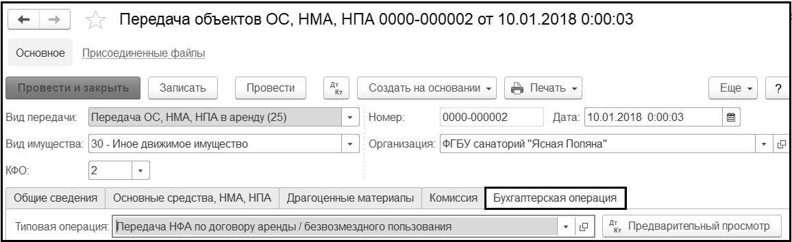 На данной закладке для формирования проводок в соответствии с указанным Видом передачи в реквизите Типовая операция выбирается единственная операция - Передача НФА по договору аренды / безвозмездного пользования.