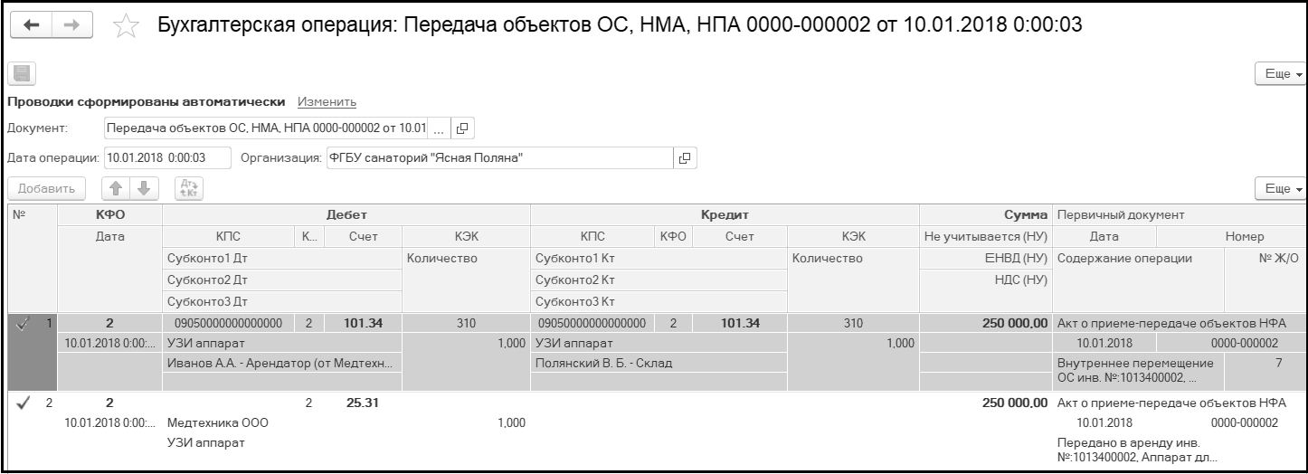 После заполнения реквизитов документ следует провести и закрыть. В результате проведения документа, которым отражается передача оборудования в операционную аренду, формируются следующие бухгалтерские записи: