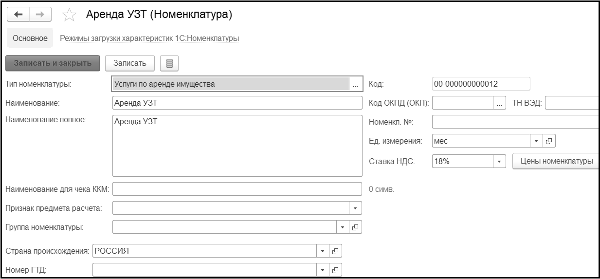 Информация о предоставлении права пользования имуществом вносится в справочник Номенклатура. Добавим в справочник Номенклатура новый элемент – Аренда УЗТ (ультразвуковой техники), тип номенклатуры – Услуги по аренде имущества, ед. изм – месяц.