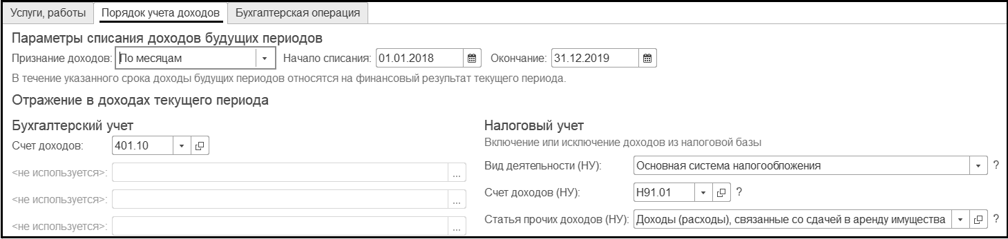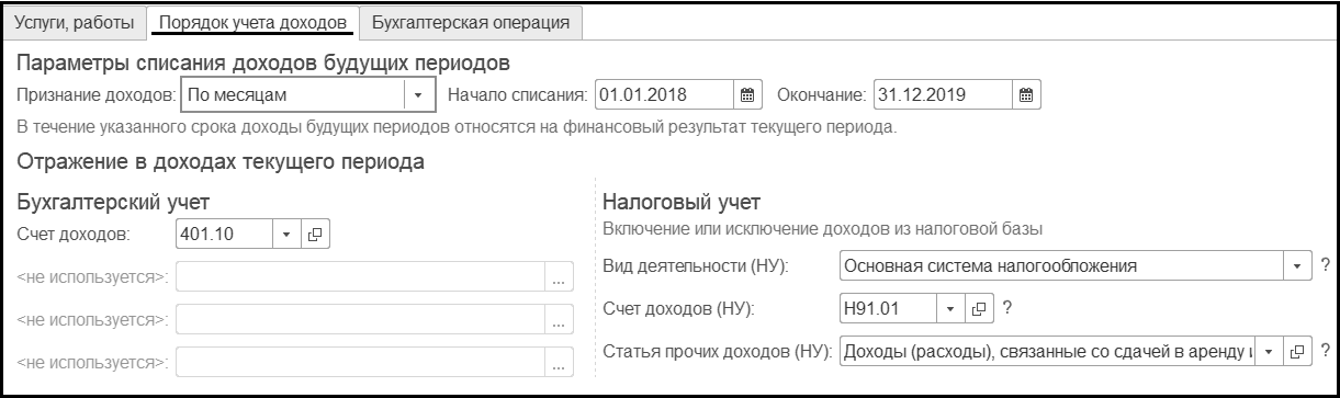 Начало списания, Окончание списания – период, в течение которого доходы будущих периодов будут относиться на финансовый результат текущего периода;
