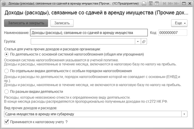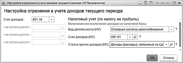 Отражение в доходах текущего периода – указываются счет и аналитика бухгалтерского учета доходов текущего периода, а также порядок отражения доходов в налоговом учете (налог на прибыль, УСН).