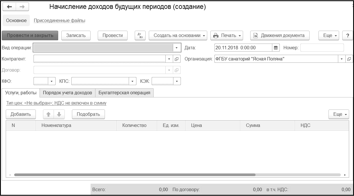Документ Начисление доходов будущих периодов предназначен для начисления в бухгалтерском учете сумм доходов, относящихся к будущим отчетным периодам, по долгосрочным договорам и соглашениям, в том числе, при предоставлении имущества в аренду и безвозмездное пользование.
