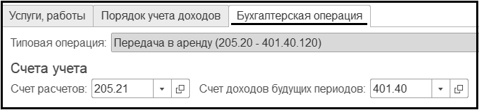 Для формирования проводок в реквизите Типовая операция следует выбрать операцию Передача в аренду (205.20 - 401.40.120).