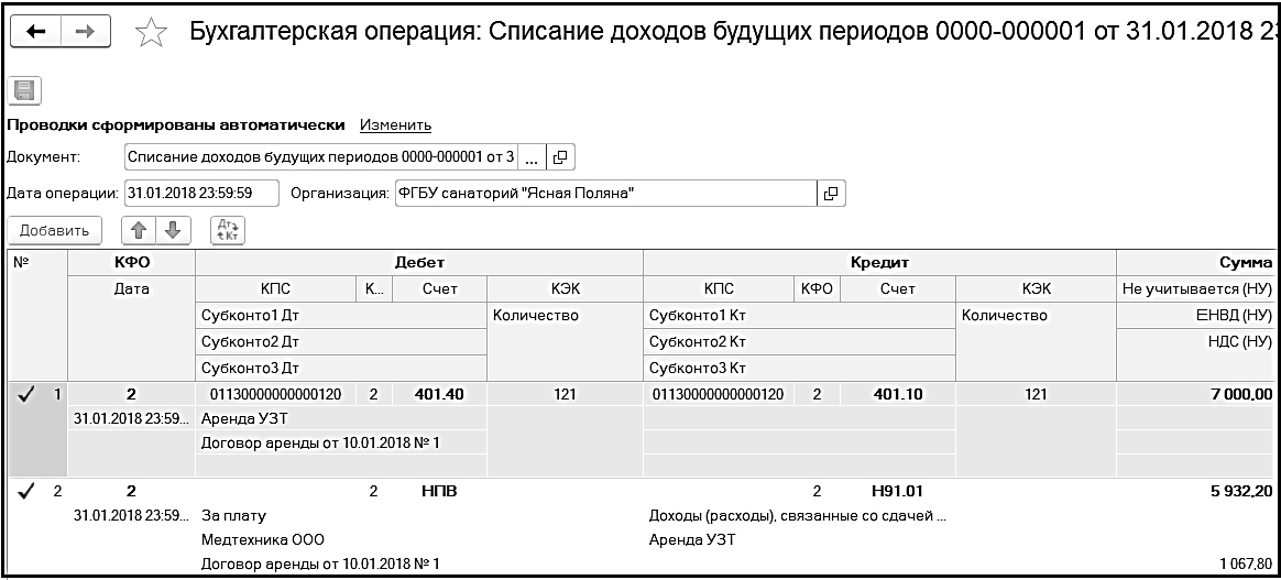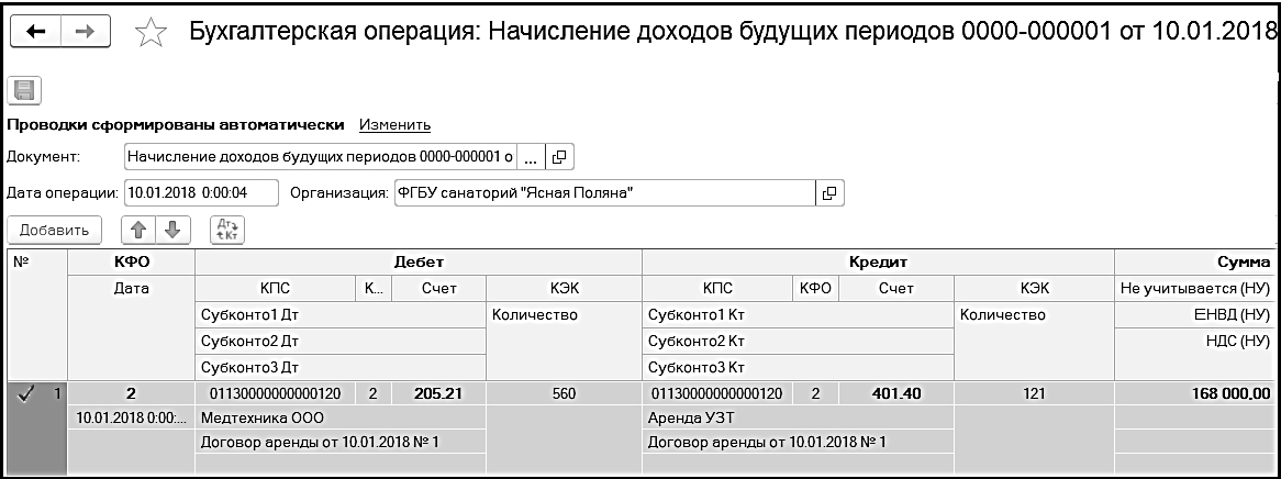 - Начисление доходов будущих периодов (205.00, 210.00 - 401.40).