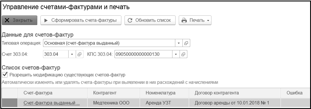 Чтобы арендодателю выставить счет-фактуру арендатору, следует из документа Списание доходов будущих периодов создать документ Счет-фактура выданный. Для это нужно перейти по гиперссылке в левом нижнем углу Управление счетами-фактурами и печать, выбрать КПС для счета 303 04 и нажать кнопку Сформировать счета-фактуры.