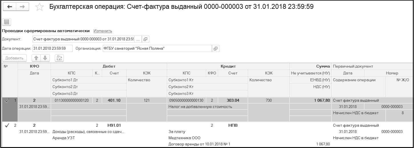 Дата документа – 31.01.2018 (согласно договора платежи по аренде поступают в конце каждого месяца).